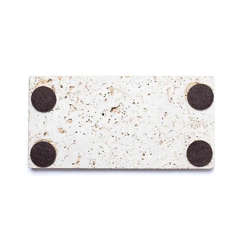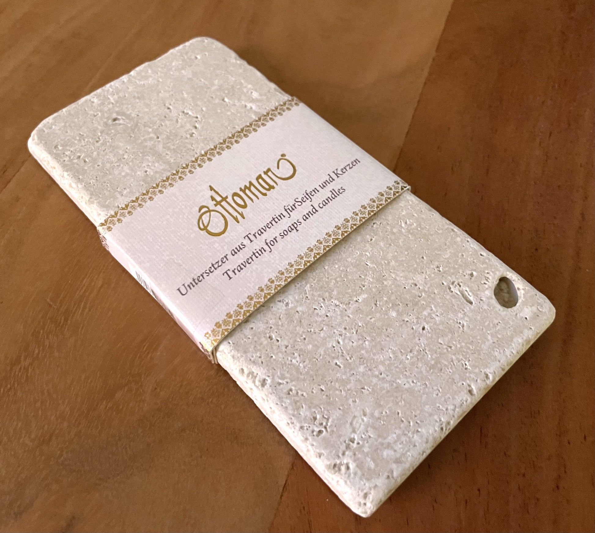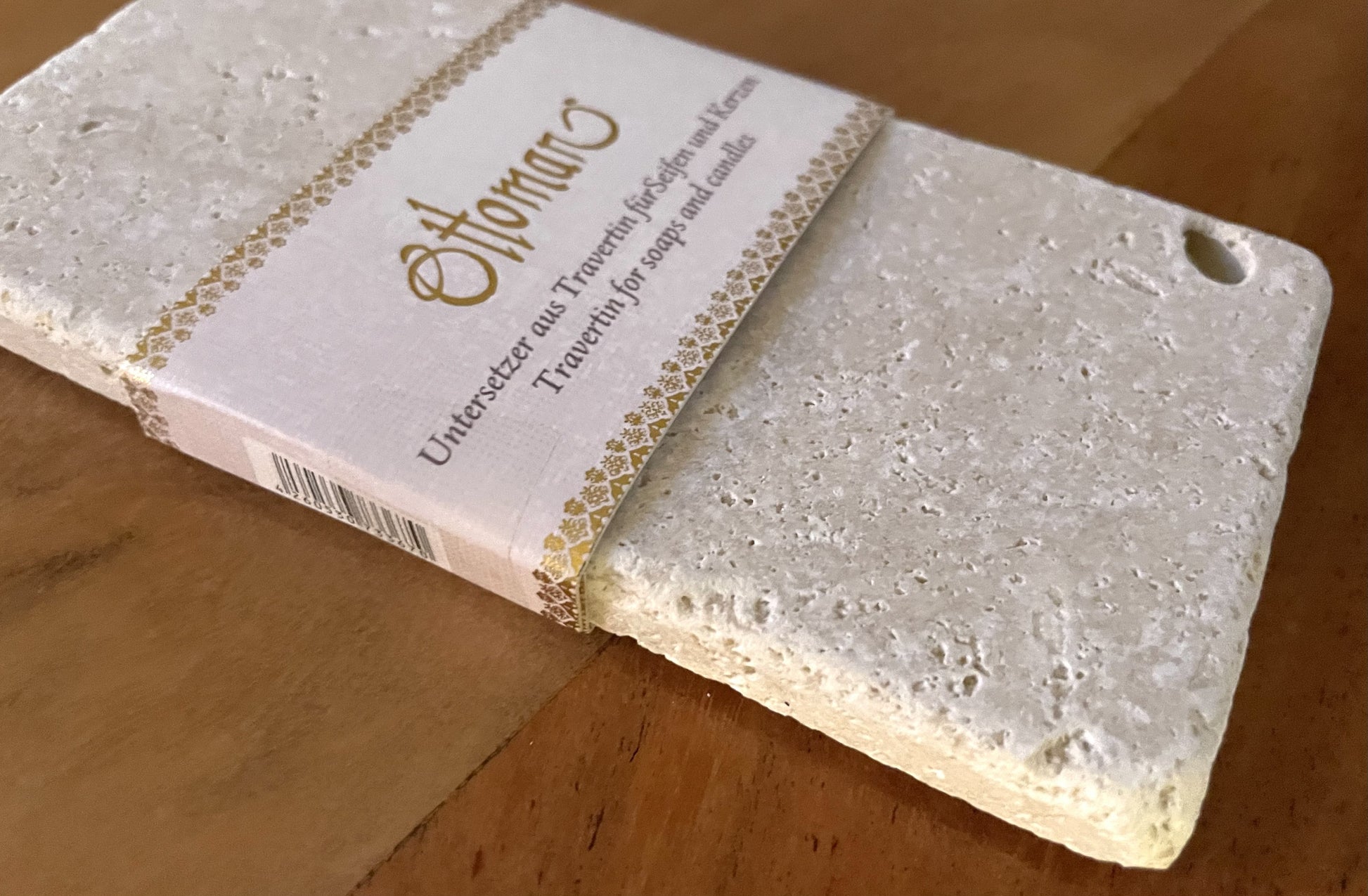 Travertin ist ein poröser Kalkstein, der in der Natur in hellen, gelblichen und bräunlichen Farben vorkommt. Die kleinen Hohlräume und Löcher im Gestein werden durch eingeschlossene Pflanzenteile während der Entstehung des Gesteins verursacht. Travertin ist durchlässig und daher ein geeigneter Stein für die Verwendung als Seifenschale.